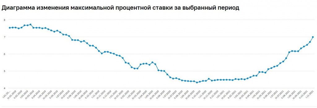 Ставка глобально снижалась в течение года с середины марта 2019-го, с марта 2020-го предприняла несколько попыток роста, однако затем продолжила снижение, дойдя в первой декаде октября 2020 года до минимального за всю историю наблюдений ЦБ (с середины 2009-го) уровня — около 4,33% годовых. Исходя из на сайте ЦБ, все второе полугодие 2020 года (примерно с середины июля) и начало 2021-го можно охарактеризовать как период относительно ровных ставок, однако начиная со второй декады марта 2021 года ставка, несмотря на небольшие исключения, демонстрирует тенденцию к росту.