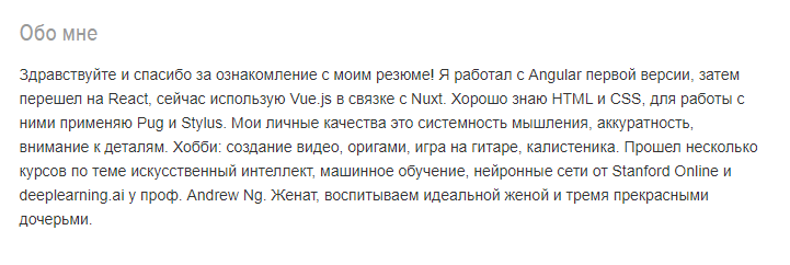 Ошибка 2. Подробно расписывать свое семейное положение, историю жизни и другую не относящуюся к специальности информацию. Число детей, так как и категория водительских прав, на ваши навыки в разработке не влияют.