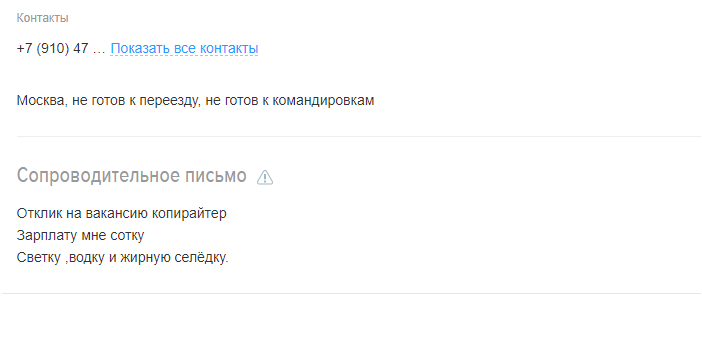 Указывайте важные для вас условия работы, чтобы потом они не стали сюрпризом для работодателя. Это могут быть: минимум по заработной плате, ниже которого вы работать не будете, удаленный формат работы, оформление только по договору или только как самозанятого, обязательное наличие ДМС и т.д.