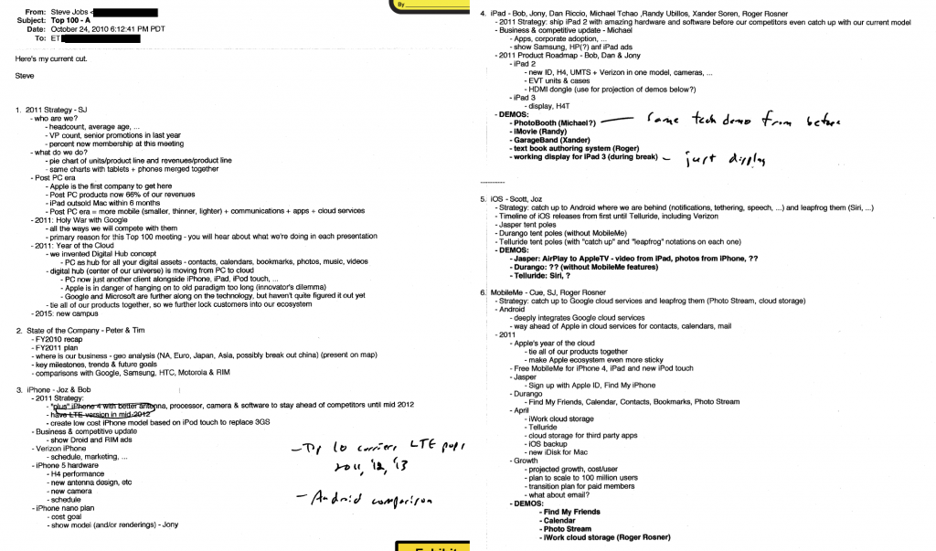 Кстати, а вот как Джобс подходил к управлению компанией. Это имейл, который стал доступен благодаря судебной тяжбе Apple против Epic. Джобс разослал по сотрудникам незадолго до смерти. В нём он расписал стратегию Apple на будущее (см. первый большой блок). Она включает всего шесть основных пунктов:
