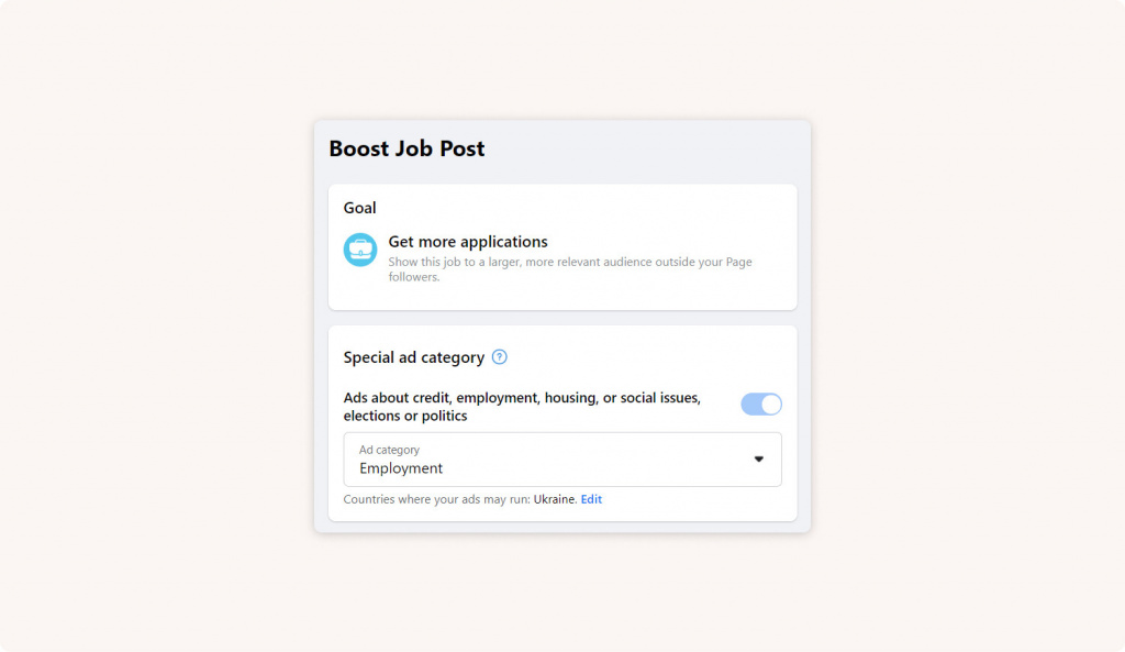 После размещения вашей вакансии на бизнес-странице вы можете настроить ее продвижение. Рекламный кабинет Facebook дает пошаговые подсказки и рекомендации по настройке кампаний, в связи с чем у вас не возникнет трудностей при выборе плейсмента или бюджета для промо.