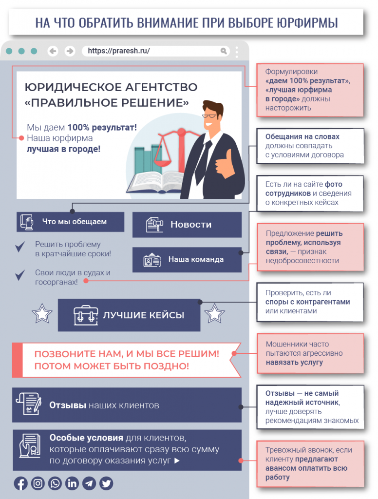 - найти официальный сайт юрфирмы (мошенники могут использовать фишинговые сайты, когда домен отличается от официального на одну букву или один символ);