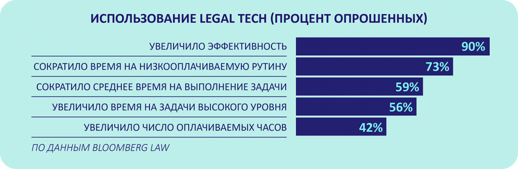 Bloomberg Law в сентябре — октябре 2021 года опросил 300 юристов в США, чтобы оценить, как они используют Legal Tech и что это им дает. Респонденты работают и в юридических, и в неюридических фирмах. Результаты исследования проанализировала американская компания Logicforce, создающая Legal Tech решения. 42% опрошенных из юрфирм подтвердили, что у них стало больше оплачиваемых часов, более трети получили больше прибыли, чем в прошлом году.