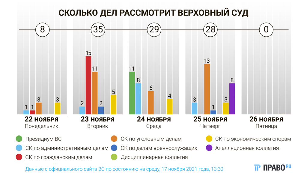 25 ноября коллегия по административным делам рассмотрит иск Генеральной прокуратуры о ликвидации международной организации «Мемориал», признанной в России НКО-иноагентом. Эта организация занимается историей политических репрессий в России. Причиной для ликвидации, по версии надзорного ведомства, стали «систематические нарушения законодательства об иностранных агентах». Истец настаивает, что «Мемориал» не маркировал свои материалы как иноагент. Сама организация называет решение политическим и настаивает, что «никаких законных оснований» для ликвидации нет (дело № АКПИ21-969).