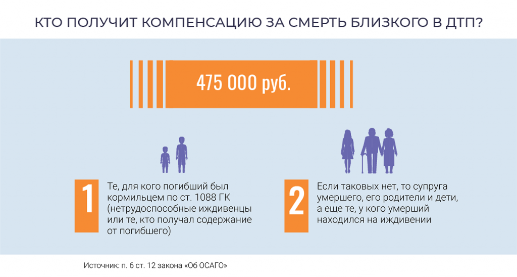 В этих пунктах говорится, что граждане, которые потеряли кормильца в результате ДТП, имеют право получить 475 000 руб. Если же таких лиц нет, то претендовать на деньги могут также супруга погибшего, его родители и дети, а еще те, у кого умерший находился на иждивении.