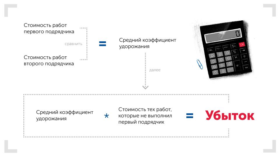 Считать убытком всю стоимость работ привлеченных подрядчиков некорректно. В суде такое заключение могут оспорить. Экспертам нужно сравнить стоимости работ по каждой позиции обоих подрядчиков для получения коэффициента удорожания. Затем он умножается на стоимость тех работ, которые не выполнил первый подрядчик. Полученная сумма и будет считаться убытком, который заказчик в любом случае понесет, так как объект должен быть построен.