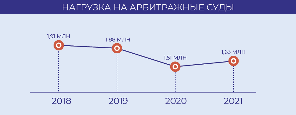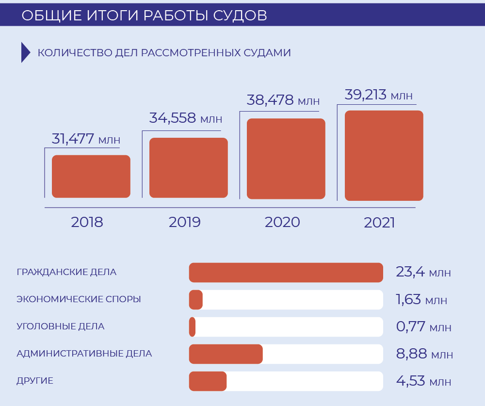 Нагрузка на российских судей продолжает расти, хотя темпы уменьшились: в 2021-м они рассмотрели 39,23 млн дел против 38,18 млн годом ранее. Прирост составил 2,5%, для сравнения в 2020-м нагрузка выросла на 9%.