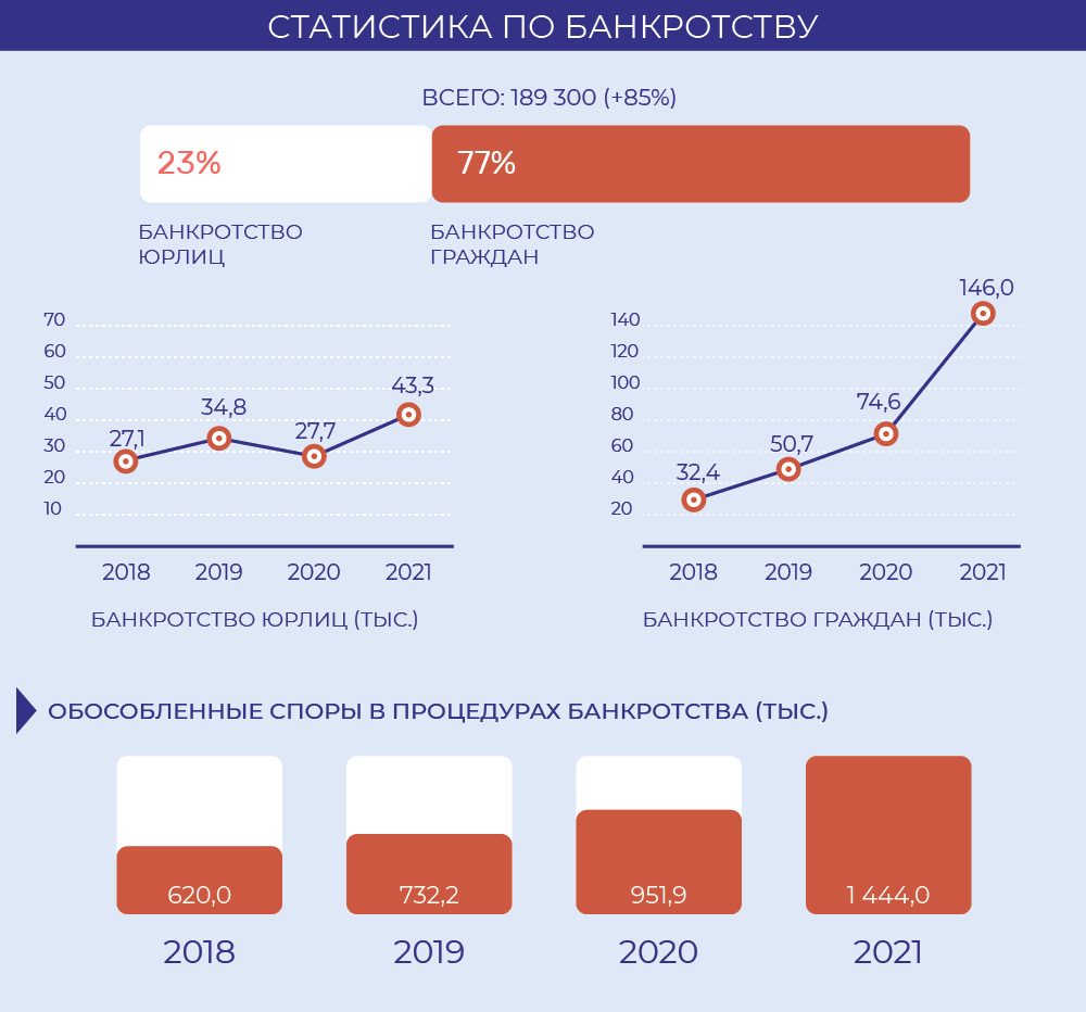 Семейных разбирательств стало больше сразу на 19%. Возможно, так проявляется отложенный эффект пандемии: россияне стали чаще разводиться. Суды рассмотрели 462 000 дел о расторжении брака против 408 000 в 2020-м. Алиментных споров стало больше на 28%: их в 2021-м было 326 000.
