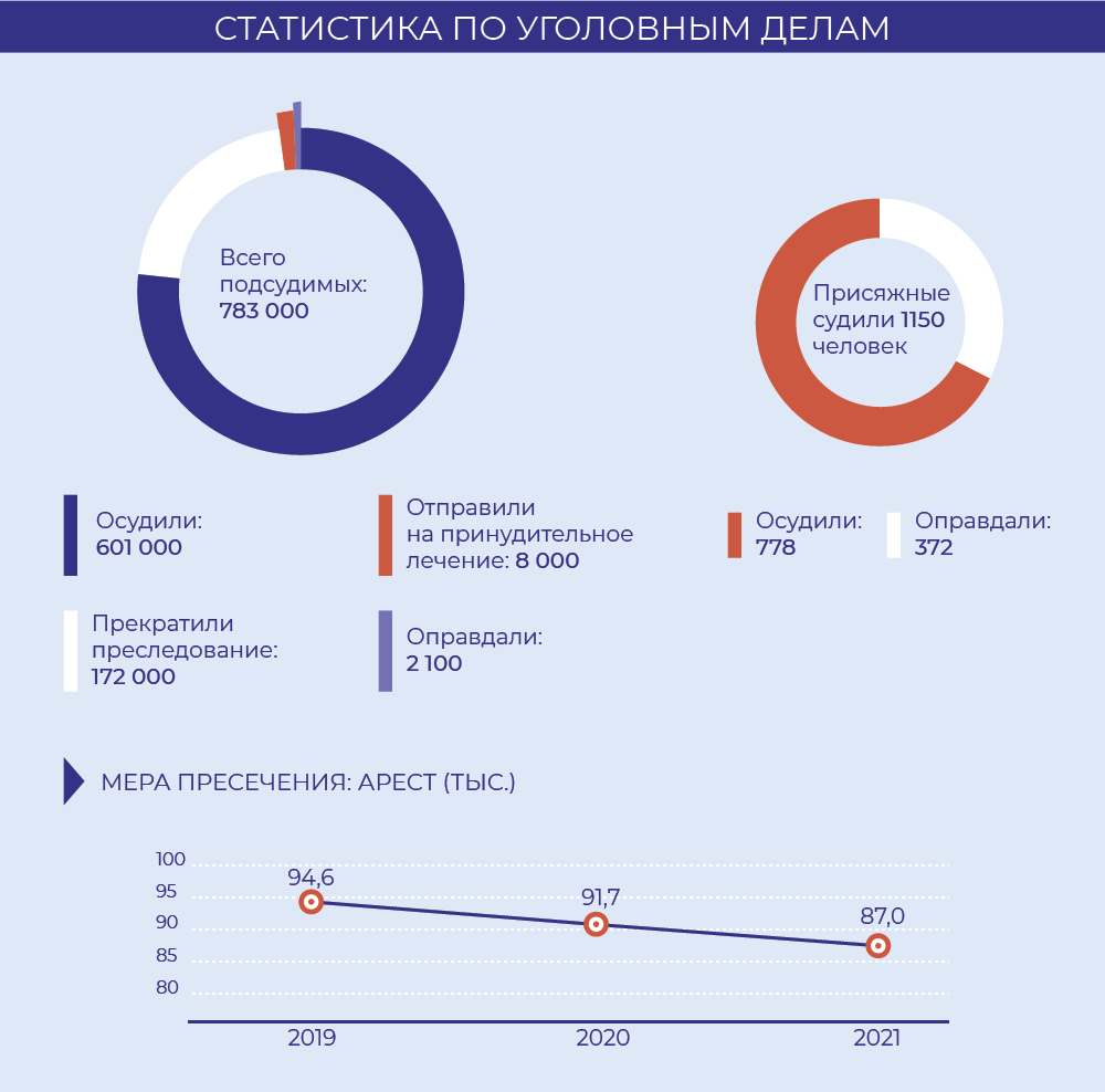В 2021 году суды рассмотрели 770 000 уголовных дел в отношении 783 000 человек и вынесли обвинительные приговоры в отношении 601 000 человек. Оправдали только 2100 из общего числа подсудимых, при этом 372 оправдательных приговора были вынесены с участием присяжных. Около 8000 человек отправили на принудительное лечение. По всем остальным обвиняемым суды прекратили уголовное преследование по различным причинам.
