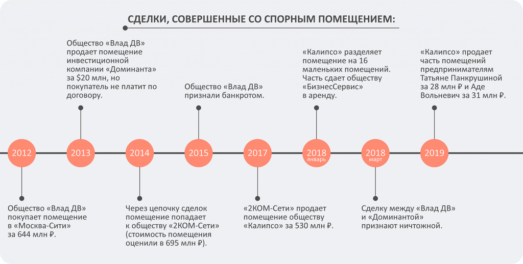 Летом 2012-го общество «Влад ДВ» купило помещение площадью 2 500 кв. м в «Москва-Сити» за 644 млн руб. А через год компания перепродала актив инвестиционной компании «Доминанта» за $20 млн (661 млн руб. по тогдашнему курсу). Новый собственник зарегистрировал помещение на себя, но деньги продавцу так и не перечислил. После этого в 2014 году с объектом совершили еще ряд сделок, в итоге оно оказалось в собственности у «2КОМ-Сети».