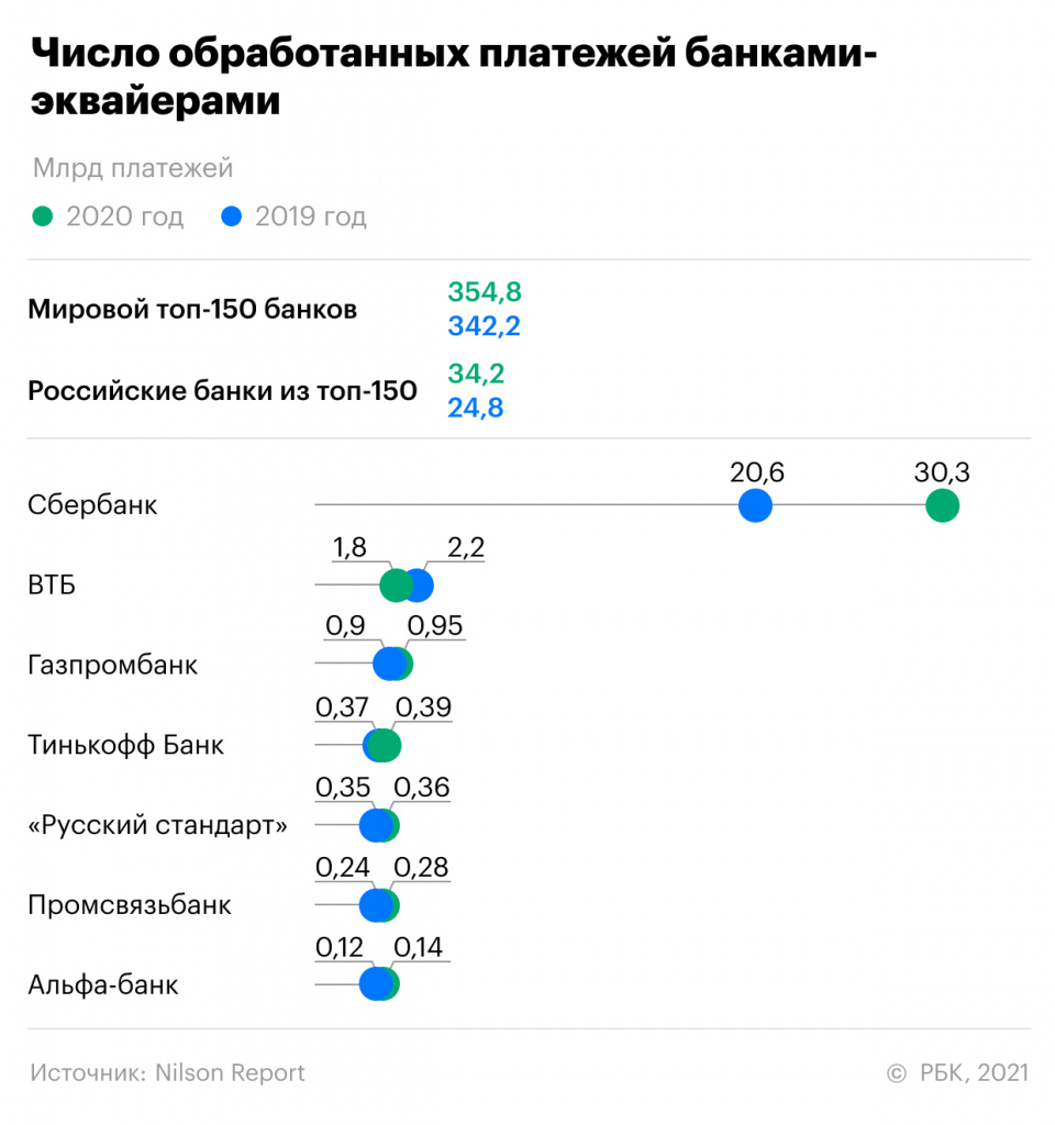Всего банками из топ-150 было в 2020 году было обработано 354,8 млрд транзакций, что на 2,8% больше по сравнению с уровнем 2019 года. В перечне российских банков самое значительно изменение — у Сбербанка, который в 2020 году обработал 30,3 млрд платежей. В 2019 году этот показатель у «Сбера» составлял 20,6 млрд (доля увеличилась с 6 до 8,6%). Позиция в самом рейтинге у крупнейшнего российского банка не изменилась — он сохраняет третье место, уступая глобальной эквайринговой компании FIS (34,2 млрд обработанных платежей) и американскому JPMorgan Chase (35,6 млрд обработанных платежей). Их доли в мировом рейтинге составляют 9,6% и 10% соответственно.