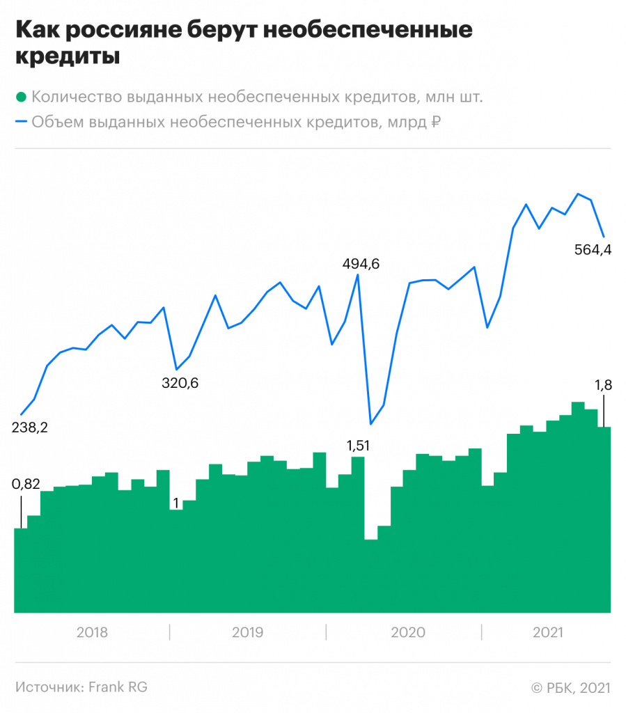 В октябре темпы необеспеченного кредитования в России показали самый резкий спад в месячном выражении с пандемийной весны 2020 года, следует из предварительных расчетов Frank RG (есть у РБК). По оценкам аналитиков, банки выдали населению 1,8 млн кредитов наличными на 564,4 млрд руб. По сравнению с сентябрем количество новых ссуд сократилось на 8,7%, а объем — на 10,6%.