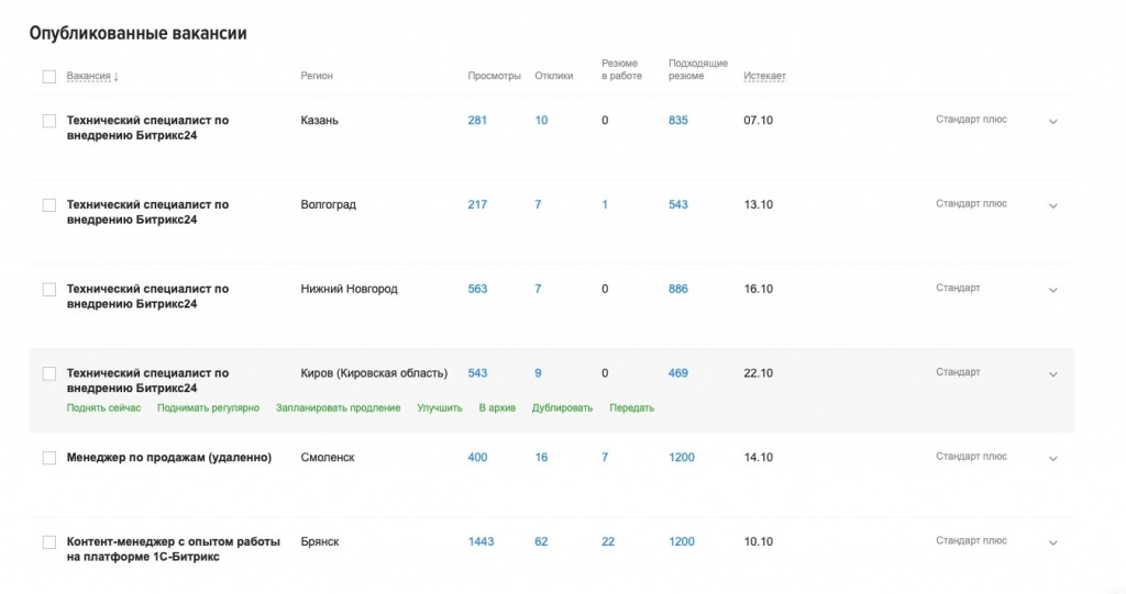 3.3. В разы увеличили количество объявлений с вакансиями на всех доступных сайтах по поиску работы. Нам говорили, что раз вакансия размещена на HeadHunter, то ее увидят все заинтересованные кандидаты, так как это самый популярный ресурс в СНГ. Это правда, но, как оказалось, далеко не вся. Во-первых, важно на какой позиции и по какому тарифу размещена вакансия. Во-вторых, в разных регионах люди пользуются разными сайтами для поиска работы. Именно поэтому мы стали размещать объявления на большем количестве площадок (в том числе и HeadHunter — разместили и там копии объявлений на одну вакансию по разным городам).