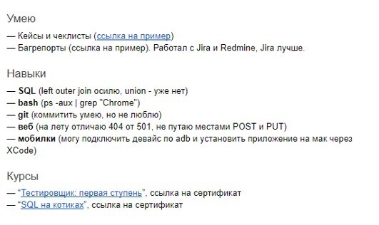 Не забудьте в этом же разделе указать название конференций, хакатонов, которые вы посетили. Сюда же можно добавить списки прочитанных книг и документаций.