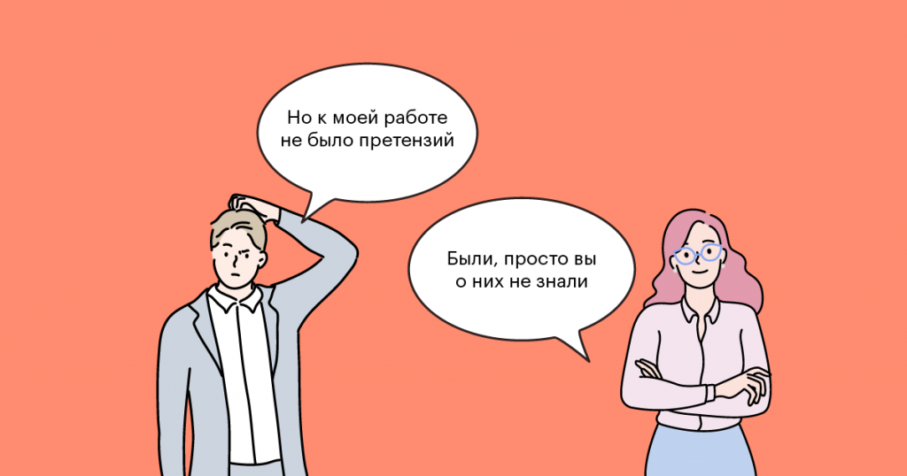 Представьте: руководитель недоволен сотрудником, но молчит и копит раздражение в себе. Однажды терпение кончается: он понимает, что больше так жить нельзя — пора увольнять. Но сотрудник и не подозревает, что им недовольны, ведь обратной связи не было. Вдруг его вызывают в переговорку и сообщают об увольнении. Нормальная реакция в такой ситуации: шок, обида, гнев, ощущение несправедливости и предательства.