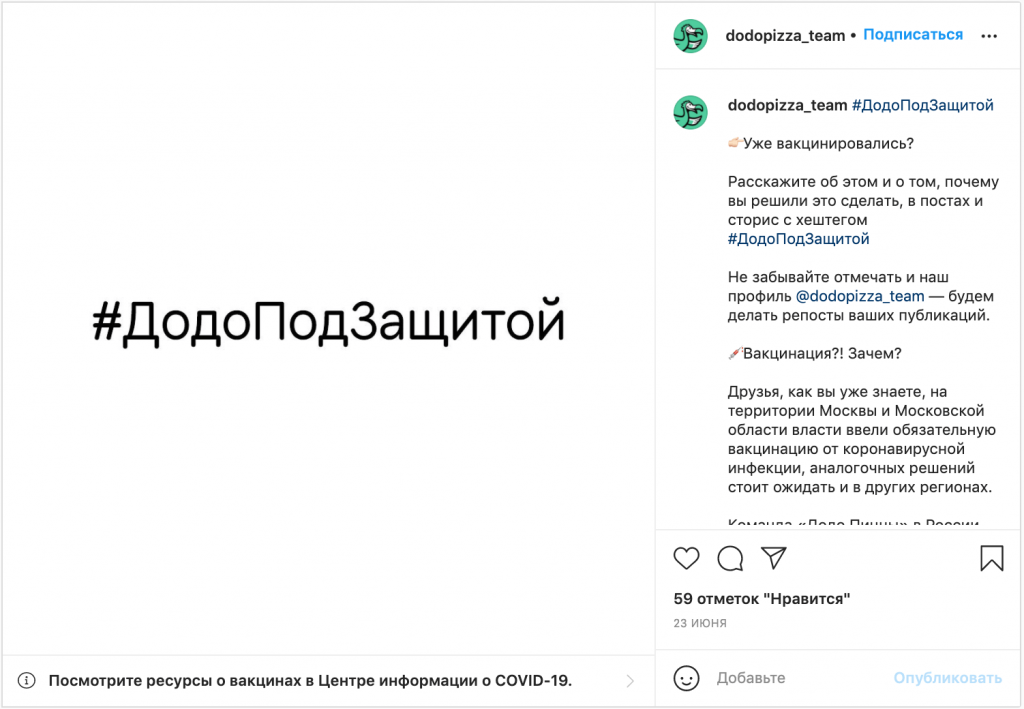 Призвали всю команду управляющей компании пройти вакцинацию и запустили флешмоб #ДодоПодЗащитой. Начали с СЕО и топ-менеджмента — они выкладывали посты в соцсетях о том, что они прошли вакцинацию. Дальше этот флешмоб начали поддерживать сотрудники и управляющие в пиццериях, которые организовывали групповые походы на вакцинацию.