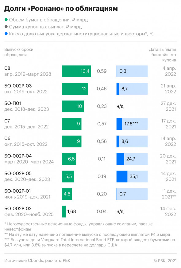 Суммарный объем выпусков облигаций «Роснано» составляет ₽71,58 млрд. Компания разместила девять выпусков. Бумаги трех серий (06, 07, 08) на ₽31,4 млрд с погашением в 2022 и 2028 годах покрыты гарантиями Минфина, облигации на ₽40,18 млрд не имеют защиты. В декабре «Роснано» предстоит выплатить купоны по бумагам пяти серий и погасить один выпуск облигаций на ₽4,5 млрд.