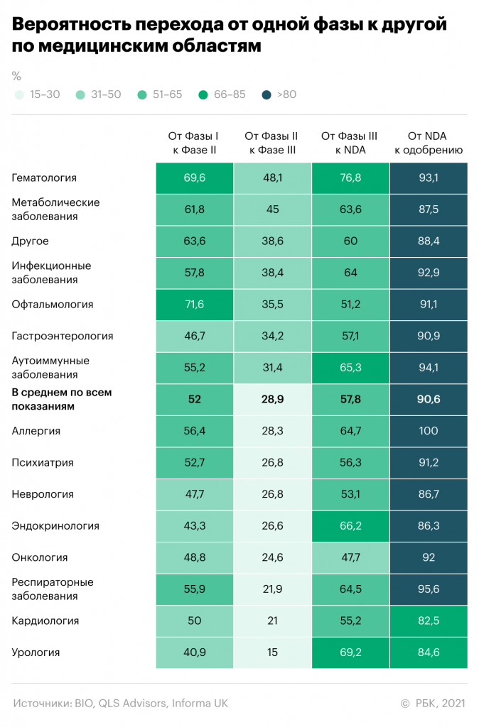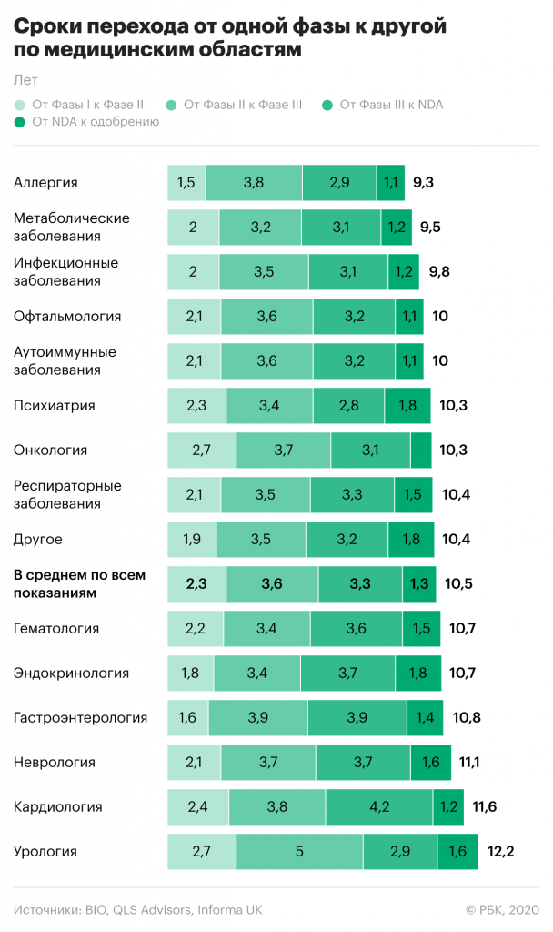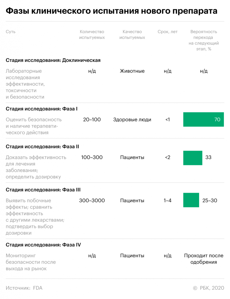 В итоге только 5–7% разрабатываемых лекарств проходят все три фазы клинических испытаний и получают одобрение. Процесс разработки препарата и его исследования может занять 10–12 лет.