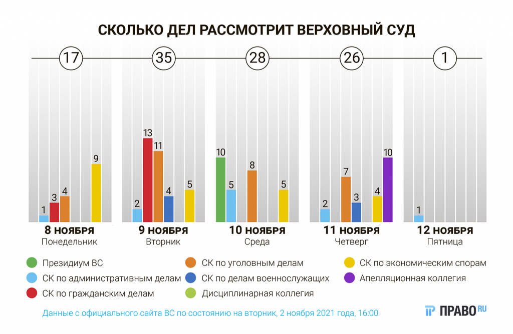 В дисциплинарной коллегии на неделе ничего не запланировано, но «судейские» дела есть коллегии по административным делам. Всего же с 8 по 12 ноября там рассмотрят 11 жалоб: