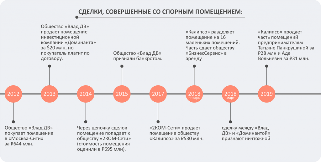 Летом 2012-го общество «Влад ДВ» купило 2 500 кв.м в «Москва-Сити» за 644 млн руб. А через год компания перепродала актив инвестиционной компании «Доминанта», но уже почти за $20 млн. Новый собственник зарегистрировал помещение на себя, но вот деньги продавцу так и не перечислил. После этого в 2014 году с дорогим имуществом совершили еще ряд сделок, в итоге оно оказалось в собственности у «2КОМ-Сети».
