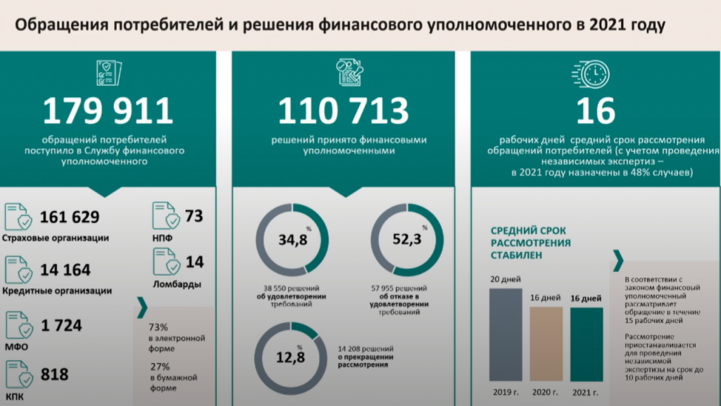Главный финансовый уполномоченный Юрий Воронин представил статистику работы с 2019 по 2021 год. Он рассказал, что основной объем дел, который рассматривает служба, связан со страхованием, среди них лидируют споры по ОСАГО. Спад обращений в 2021 году (по сравнению с 2020-м) Воронов объяснил началом работы претензионного порядка: прежде чем обращаться к финансовому уполномоченному, надо написать претензию к финансовой организации.