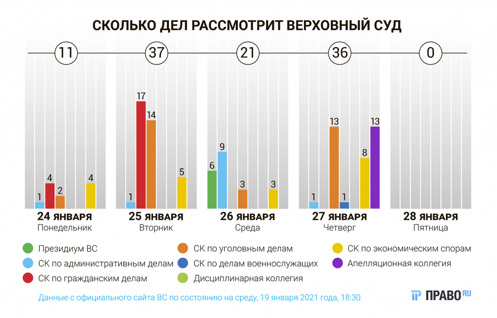 Коллегия по административным делам рассмотрит 12 дел. Среди них иск Ивана Стрешенца — мирового судьи из Керчи (Республика Крым) в отставке. В конце 2021-го ВККС разрешила СКР возбудить уголовное дело на Стрешенца по статье о вмешательстве в деятельность следователя (ст. ч. 2 ст. 294 УК). Силовики считают, что судья устроил смертельное ДТП, а затем договорился с местным жителем, чтобы тот взял на себя ответственность за произошедшее. За это Стрешенец якобы предложил мужчине 1,5 млн руб. и автомобиль. Сам судья настаивал, что срок давности по этому событию уже прошел, поэтому дело не могли возбудить, но ВККС все равно разрешила следователям сделать это (№ АКПИ21-1036).